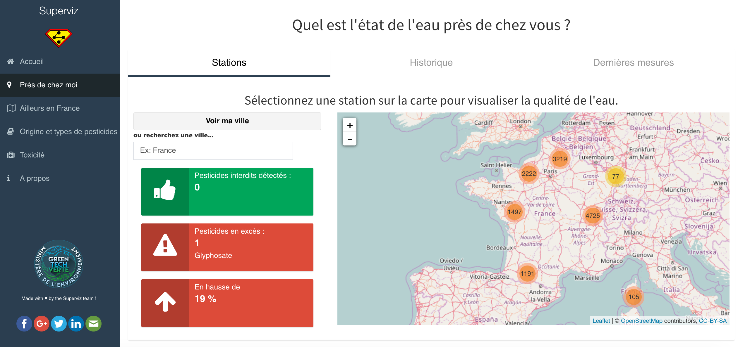 The GreenTech challenge is a Dataviz competition launched by the French Ministery of environment that took place in 2017. A huge dataset concerning pesticides in France has been released, and the goal was to build innovative visualizations to sensibilize and inform citizen concerning the french situation over the past 6 Years.