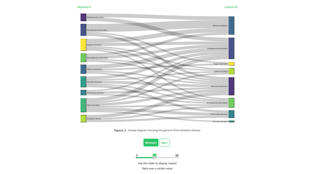 Online appComorbidity is defined as the presence of 1 or more disorders in relation to an index disorder. I've been involved in a project with the Queensland Brain Institute (Australia) and the University of Aarhus (Denmark) to build an interactive website allowing to explore the discovered patterns of comorbidity between mental disorders.