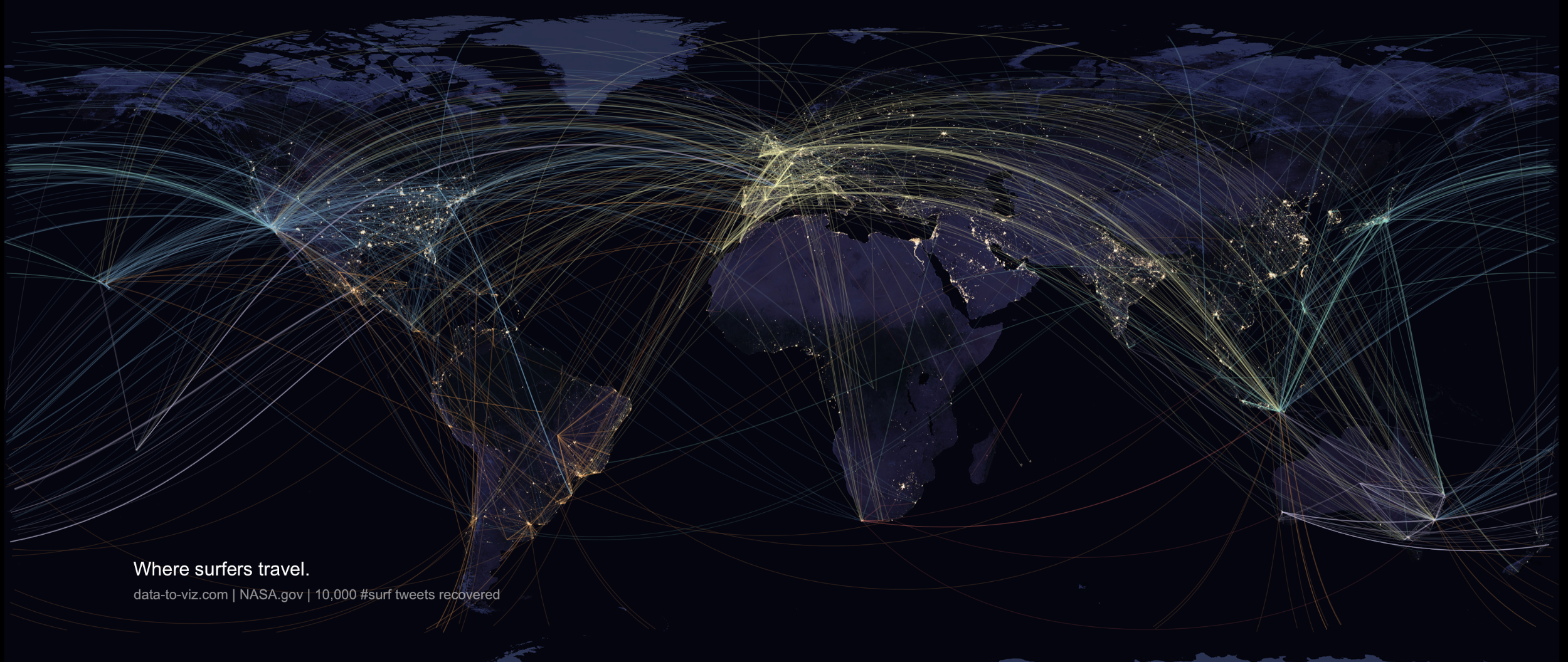 I recovered tweets containing #surf for 9 months. Here is where surfers travel.