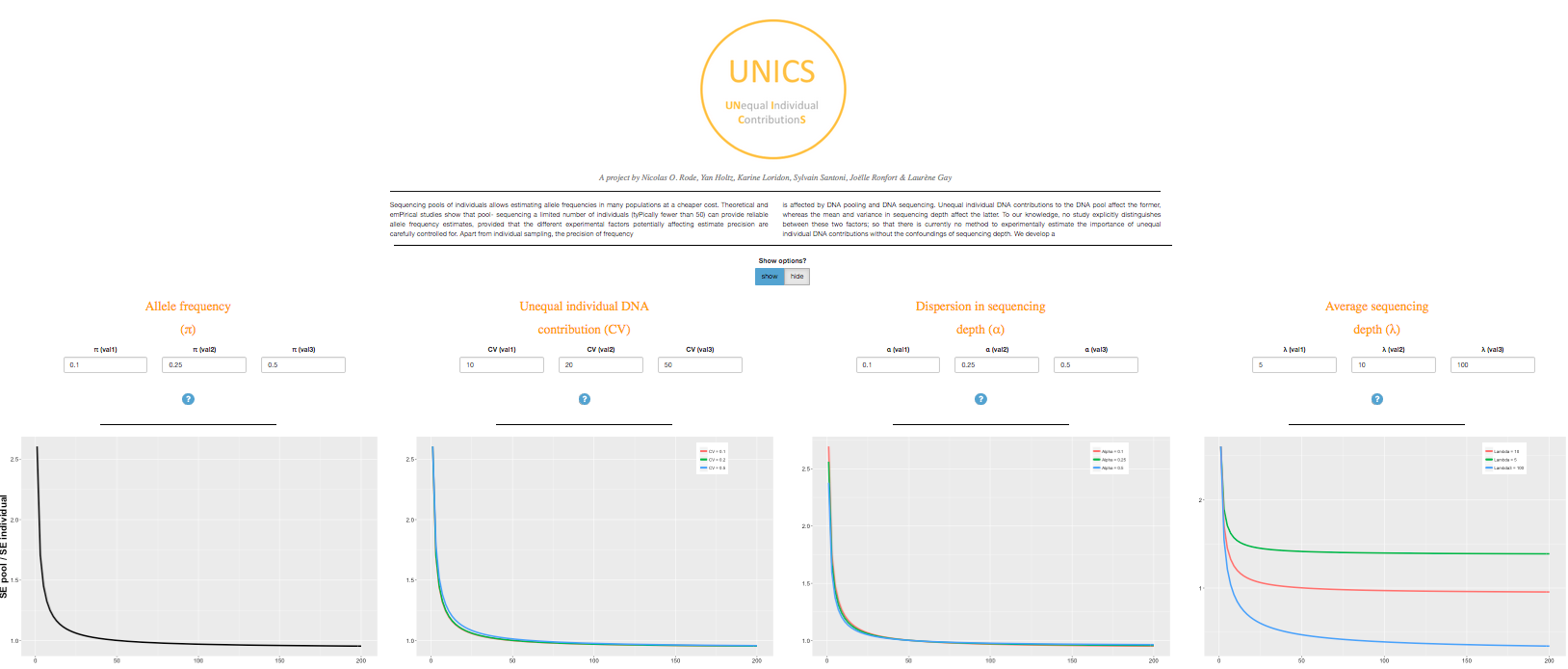 Online appUNICS is a web app that helps you computing the standard error of allele frequency estimations of future pool-sequencing experiments based on different parameters. You can use it trough the online version and read the related publication.